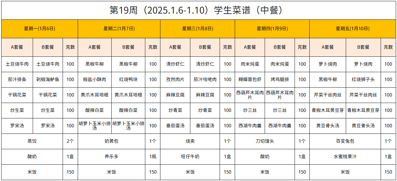第19周(2025.1.6-1.10)学生菜谱(中餐)